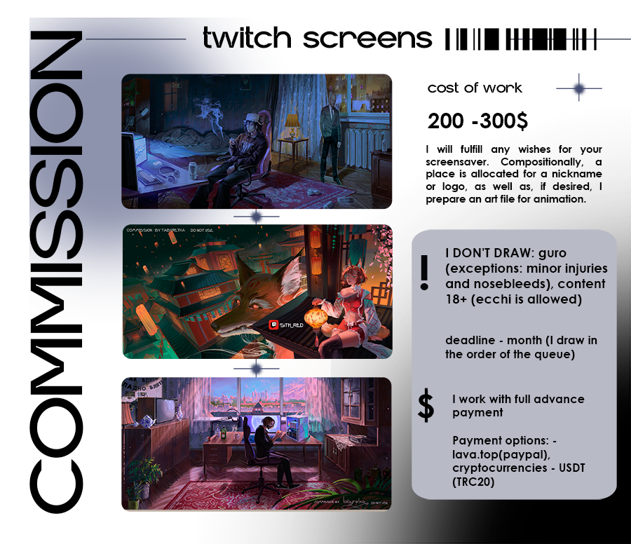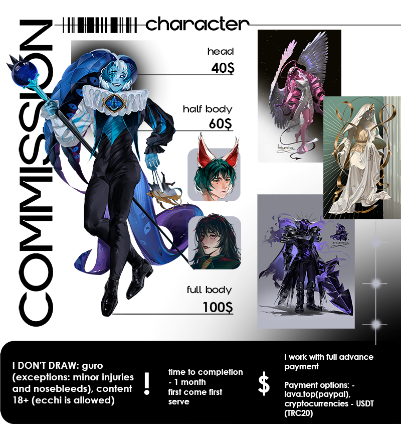 I also want to warn you that any commissions can be posted on my social networks - refusal of this - 50% of the cost.